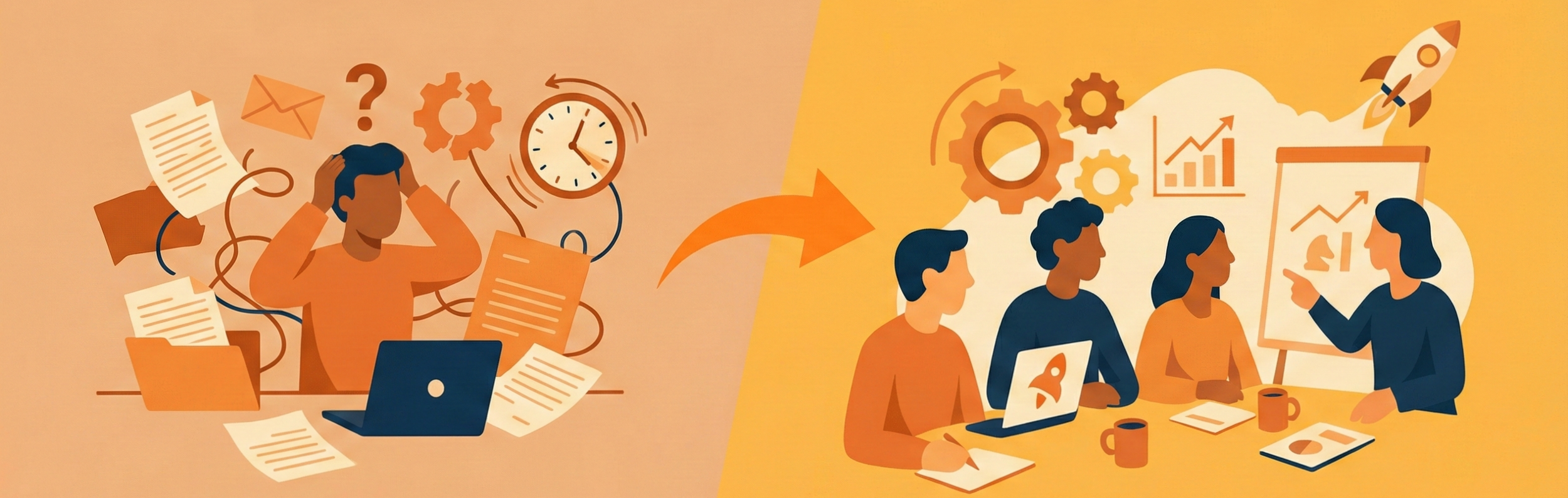 De machinekamer rammelt: Je team (vast of freeelance) mist duidelijke structuren, doelstellingen en ritme. Je bedrijf voelt als een reeks losse onderdelen waarbij jij de lijm bent.